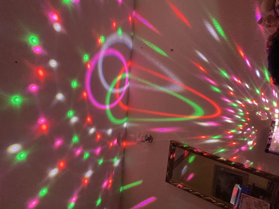 The image displays a room illuminated by a rotating disco ball. Vivid red, green, and purple lights project onto the walls, creating circular and scattered patterns. A mirror with a gold frame is visible on the lower right, reflecting the light show. A wall-mounted decorative piece is near the corner of the room. The overall effect is a vibrant and festive atmosphere.