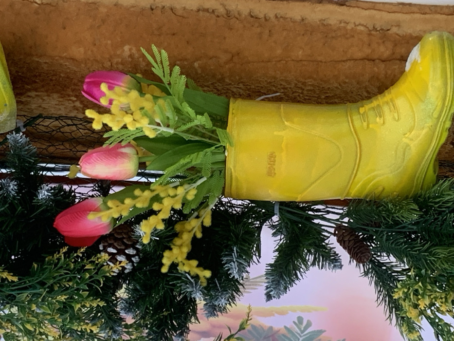 This image captures a close-up of a decorative display in the city of Фоки, Russia. A bright yellow utility boot, embossed with the text "БОРЕЦ" (BOREC) on its upper shaft, is mounted vertically. It functions as a vase, containing a bouquet of artificial flowers. The bouquet comprises three pink tulips and multiple sprays of yellow mimosa-like blossoms, accompanied by green artificial foliage. To the immediate left of the boot, an artificial evergreen garland, adorned with pinecones and lightly frosted accents, is visible, secured by white zip ties. The background to the right of the boot is a textured, light brown surface, likely a wall. A blurred, lighter background in pastel tones of pink and purple is visible behind the garland. No individuals, direct actions, or interactions are present in the scene.
