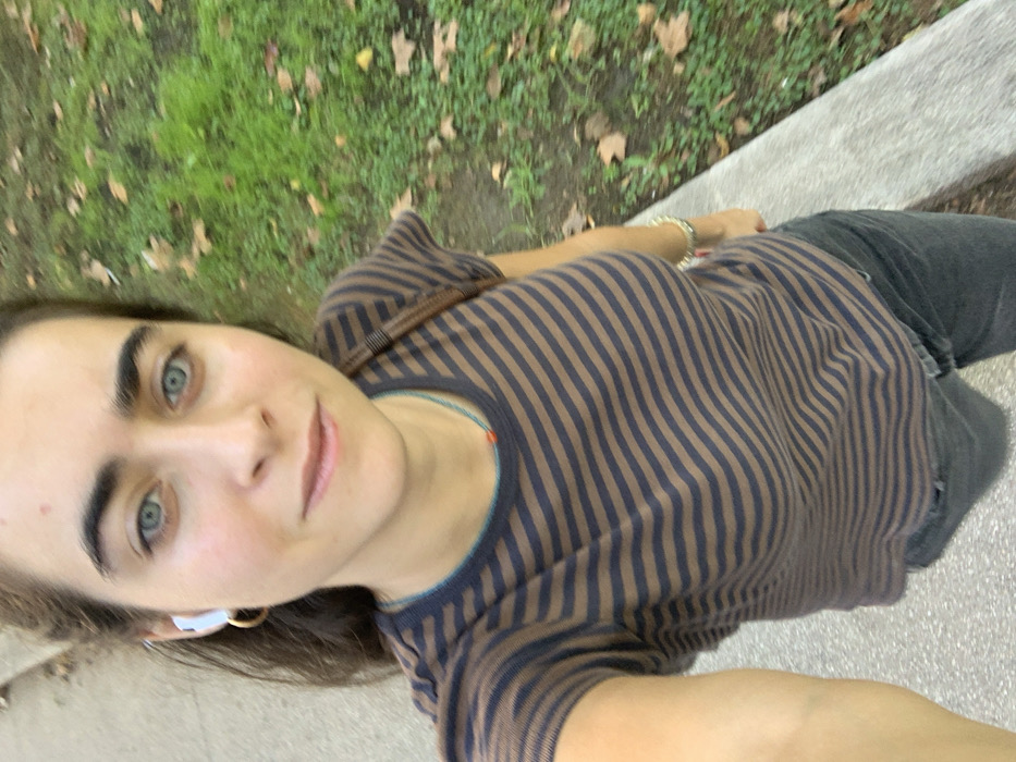 This image depicts a female individual taking a selfie outdoors in Lisbon, Portugal. The subject has fair skin, light blue eyes, dark eyebrows, and long dark hair. She is wearing a short-sleeved t-shirt with horizontal brown and dark blue stripes, and dark gray jeans are partially visible. Accessories include a white earbud and a gold-colored hoop earring in her left ear, a thin light blue beaded necklace with a small orange bead, a brown strap over her right shoulder, and multiple bracelets on her right wrist. She looks directly into the camera, holding it at arm's length. She stands on a light gray paved surface, likely a sidewalk, adjacent to a grassy area scattered with dry leaves.