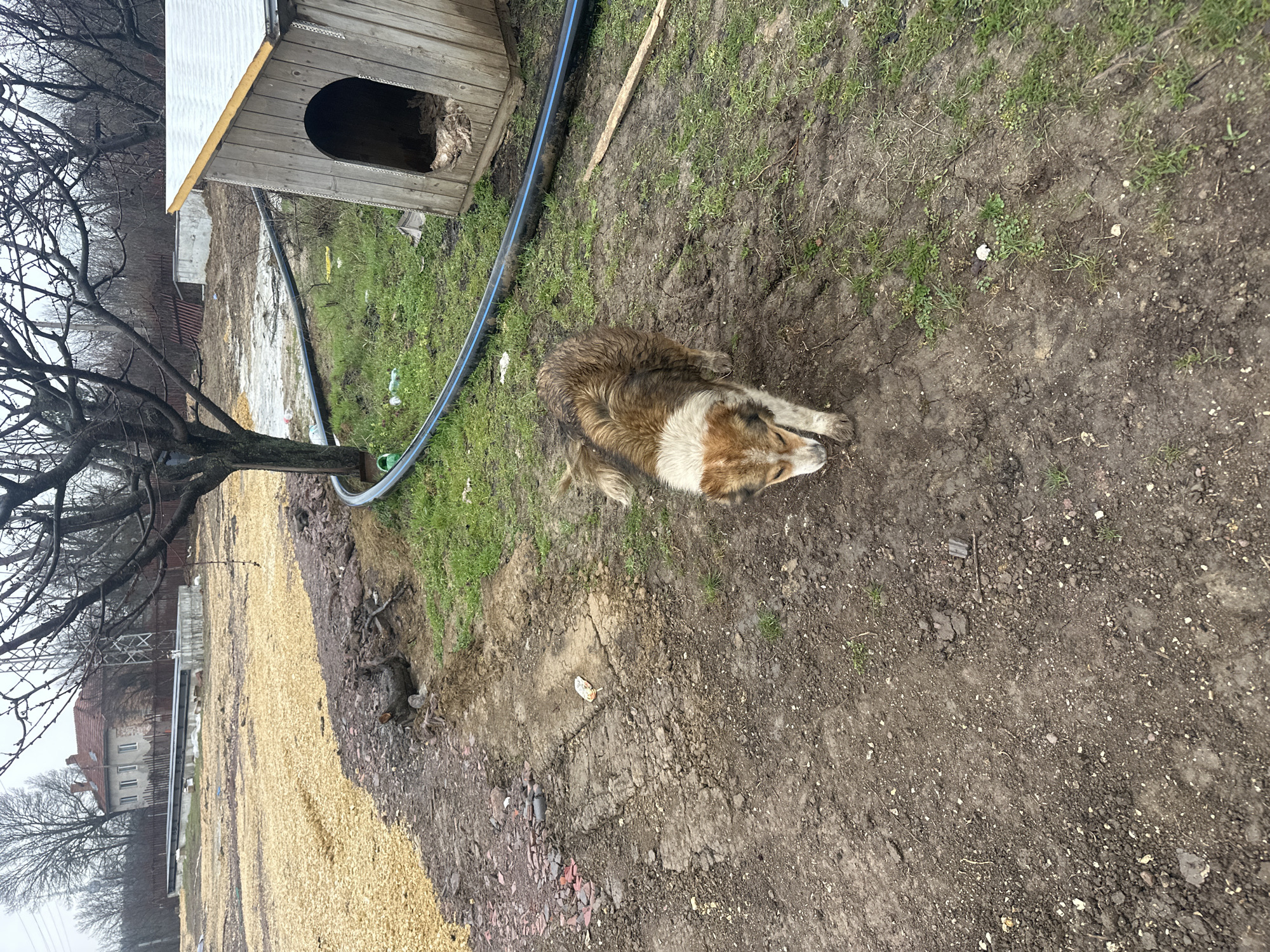 This image depicts a scene in Kalipetrovo, Bulgaria, likely in a semi-rural or residential area undergoing some development or disarray. **Central Subject:** A medium-to-large-sized dog, appearing to be a mix with medium-length fur, is the primary subject in the foreground. The dog has a brown and white coat, with a prominent white blaze on its forehead and snout, and brown markings across its back and ears. Its fur appears damp or slightly matted. The dog is positioned mid-stride, with its head lowered, actively sniffing the muddy ground. Its tail is visible, partially obscured by its body. **Foreground and Midground Environment:** The ground is predominantly a mixture of dark, damp soil and mud, indicating recent moisture. Patches of sparse, green grass are visible, particularly to the right of the dog. A roughly paved or graveled area, light tan in color, is present on the left, running diagonally into the midground. Adjacent to this graveled area, a strip of reddish-brown debris or soil is present. To the right of the dog, a light-colored wooden dog house with a grey, shingled roof is visible. Its entrance is dark, and some light-colored bedding material is discernible inside. A long, dark blue or black pipe with a thin blue stripe runs horizontally through the grassy area, extending from the left midground towards the right, passing behind the dog house. Several small pieces of litter, including plastic bottles and wrappers, are scattered on the ground near the pipe and dog house. A broken tree stump and some smaller branches lie on the ground near the graveled path. **Background Environment:** Bare deciduous trees, typical of winter or early spring, dominate the background, suggesting an overcast day with a grey sky. Through the bare tree branches, a two-story house with light-colored walls and a reddish-brown tiled roof is visible in the distance to the left. A tall, metal lattice-work utility tower or pole stands to the right of the house. A wooden fence, partially collapsed in sections, separates the immediate area from the more distant background. Further back, another concrete structure or foundation is visible beyond the fence, next to a larger area of disturbed, muddy ground.
