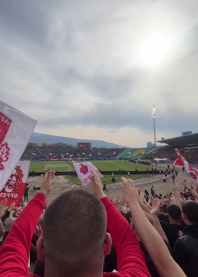 The video captures a view from within a crowd of soccer fans at a stadium. The fans are predominantly male, dressed in red and black clothing, and are waving flags with red and white symbols. Most fans are raising their hands in the air, chanting, and appear to be celebrating or expressing enthusiasm. The stadium is packed with spectators, and a soccer field is visible in the background. In the distance, a mountain range is visible under a partly cloudy sky. The sun is also visible. The overall atmosphere is energetic and spirited.