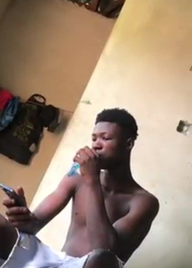 A young, shirtless Black man is sitting in a room. He's holding a smartphone in his left hand and a small water bottle in his right. He drinks from the water bottle, then looks at his phone. The room has simple, off-white walls. There are clothes hanging on a rack in the background. You can see exposed wooden beams in the ceiling. The video is shot from a low angle, looking up at the man.