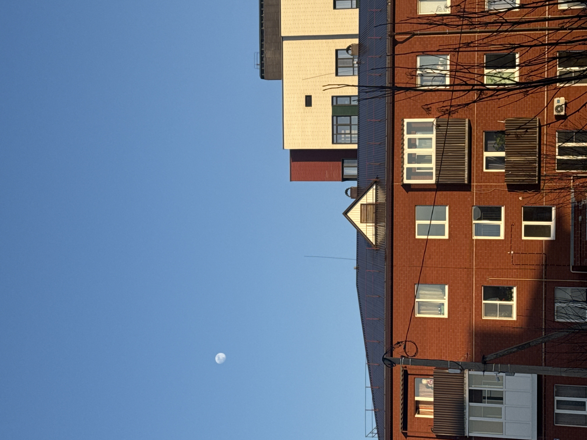 view of buildings in the city of Chernushka, Russia, under a clear blue sky. A pale moon is visible in the sky. The buildings are multi-story structures, with one building featuring a brick facade and the other having a light yellow exterior. Windows are visible in both buildings. Trees with bare branches are present in the foreground, partially obscuring the view of the brick building. The image appears to be taken from a low angle.