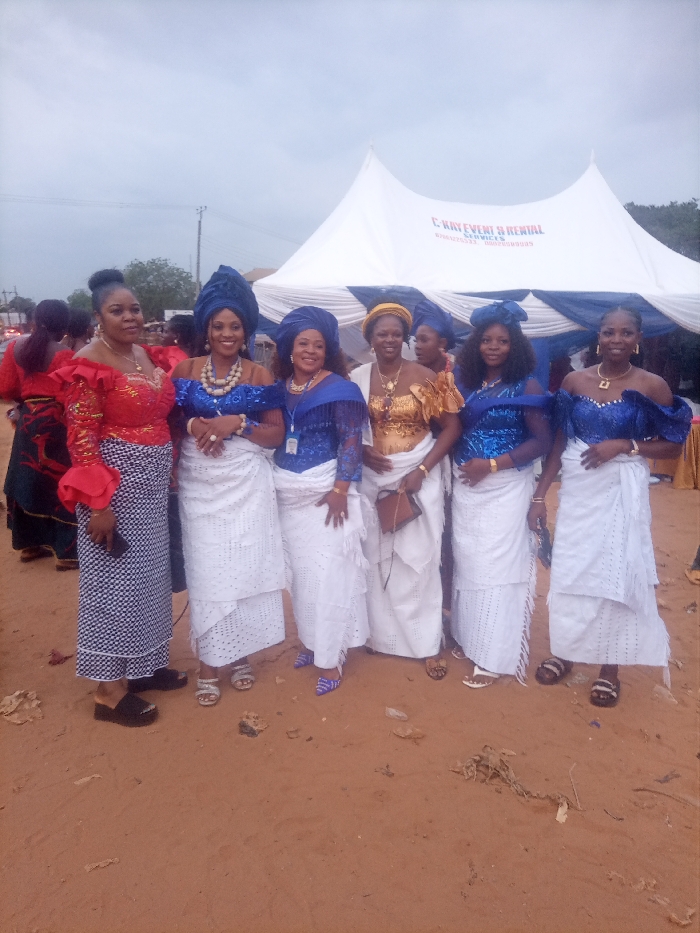 A group of six women pose for a photo in a dusty outdoor setting, with a white tent visible in the background. They are dressed in formal attire, varying shades of red, blue, and gold tops with matching head wraps, paired with white, eyelet lace wrappers. They each wear different jewelry and footwear. The atmosphere suggests a celebratory or formal event.