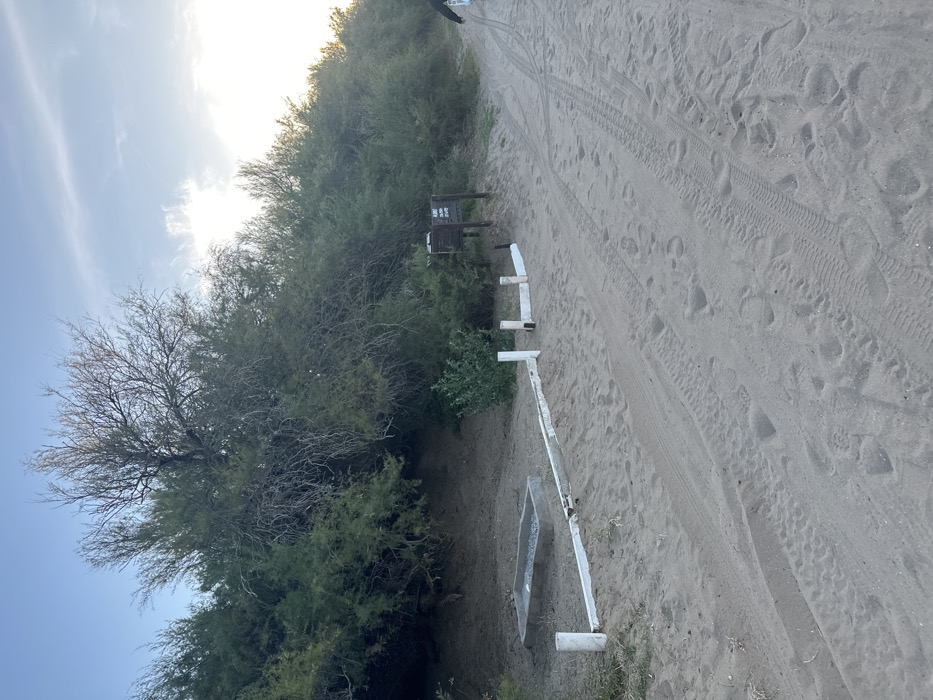 This forensic description details an outdoor scene in Mar del Tuyú, Argentina. The image displays a sandy environment dominated by a wide, light-brown pathway exhibiting multiple vehicle tire tracks and human footprints. To the left of the path, a low white barrier composed of four cylindrical posts interconnected by a horizontal beam is partially embedded in the sand. Immediately behind this barrier, a rectangular concrete basin, approximately one meter in length, is recessed into the sandy ground and contains small stones or gravel. A dense line of coastal vegetation, primarily green bushes and trees, forms a backdrop across the entire width of the scene. A taller, more deciduous tree with a significant number of bare branches is visible centrally within this vegetation line. Towards the right side, within the vegetated area and near the path, a dark wooden informational sign, approximately one meter tall, stands on two posts. A partially visible human figure, dressed in a dark garment, is present on the extreme right edge of the frame, facing away from the viewer. The sky above is blue with scattered white clouds, suggesting natural daylight conditions, possibly late afternoon or early morning.