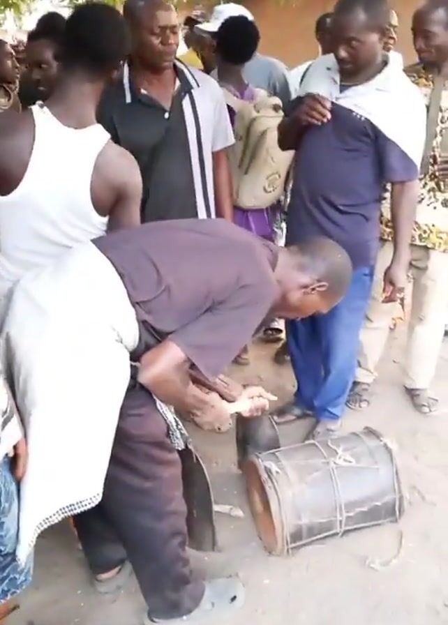 A group of about a dozen people stand in a loose gathering under the partial shade of a leafy tree. Most of the individuals are African men, dressed in casual clothing. In the foreground, a man dressed in a dark gray shirt and dark pants is bent over, using a short, thick stick to strike a drum that lies on its side on the ground. The drum is dark in color and appears well-used, with rope tied around it. Some other objects, including a pair of what appear to be metal bells, are also on the ground near the drum. The surface underfoot is a mixture of dirt and sparse vegetation. The background reveals a small, light-colored building. Some of the people are looking at the drummer while others appear to be looking in different directions.