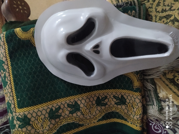 A white, plastic, Scream mask rests on a patterned rug with a green and gold border. The rug is partially draped over a wooden chair. The mask's hollow eyes and mouth give it a ghoulish appearance. The background features intricate designs on the rug. The mask is slightly tilted and positioned towards the upper right corner of the frame. The rug has a fringe or tassels. A "Redmi Note 8 AI QUAD CAMERA" watermark is at the bottom right corner.