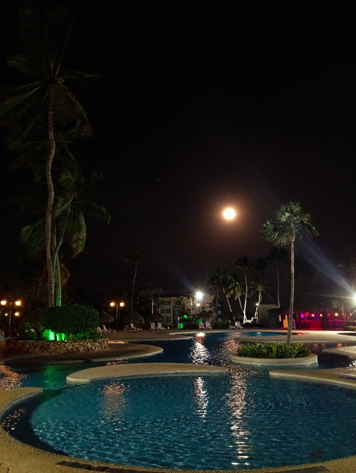 This image depicts a nighttime scene of a resort swimming pool complex in Playa El Agua, Venezuela. A bright, full moon is prominently positioned in the dark, clear sky, slightly right of the frame's center. The foreground features a multi-sectioned, irregularly shaped swimming pool with still blue water, reflecting the moonlight and various artificial light sources. No individuals are present within the observable areas of the pool or its immediate surroundings. Two tall palm trees dominate the left side of the frame, partially silhouetted against the sky, while another tall palm tree stands to the right of the pool. In the midground, landscaped areas include shrubs illuminated by green uplights, and several street lamps emit a warm, yellow glow. The background reveals dimly lit, multi-story resort buildings, interspersed with additional palm trees and further artificial lighting, including white floodlights and some red-tinted lights, indicating structures such as thatched-roof cabanas and arrays of lounge chairs.