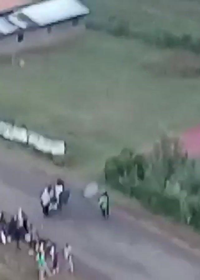 small village in a rural area, captured from an elevated position, likely atop a large rock formation. The village consists of several simple buildings, including some with red roofs. A paved road runs through the center of the village. A group of people is gathered on one section of the road near a car and motorcycles. Other individuals are walking along the road. A distinct round building with a red roof sits near the road, with flags in front of it. The area is surrounded by trees and green fields, indicating a natural setting.