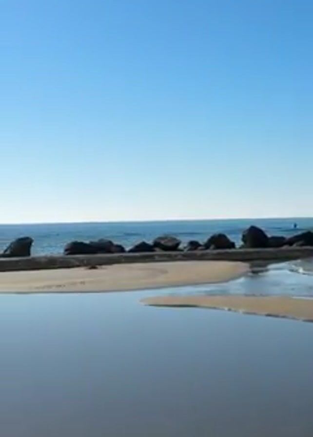 The video captures a calm beach scene under a clear, blue sky. In the foreground, there's a shallow pool of water on the sand, reflecting the sky and providing a rippled texture. Further out, there's a strip of sand leading to a rock barrier in the ocean. The ocean is visible beyond the rocks, with sunlight reflecting off the water's surface. A boat can be seen in the distance, moving across the water.