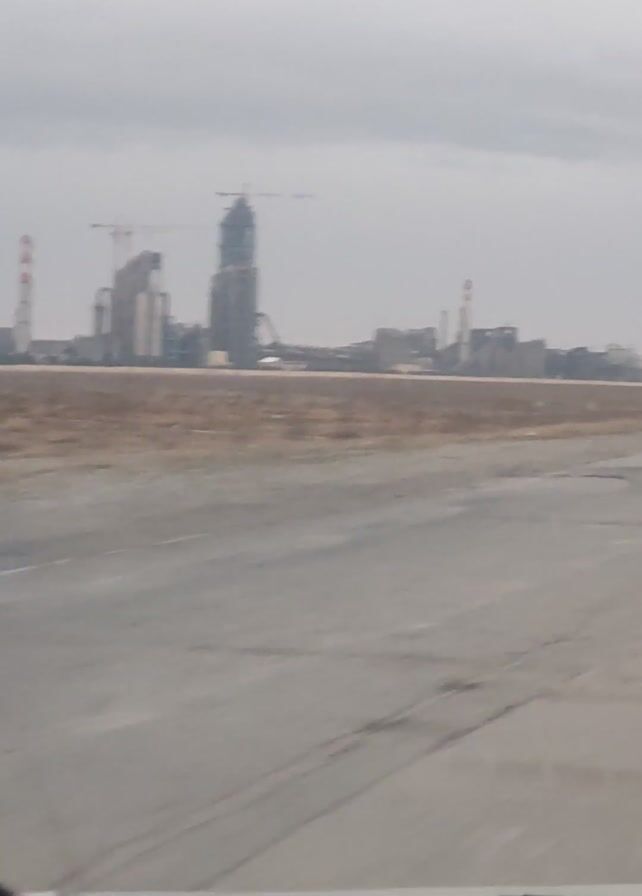 view of a city skyline from inside a vehicle, possibly a car or a plane. The skyline is somewhat obscured by fog or haze. Several tall buildings and cranes are visible, suggesting ongoing construction. The foreground consists of a concrete surface, possibly a road or airport runway. The angle is slightly tilted, with the concrete surface in the bottom right corner of the frame. The general atmosphere is subdued due to the overcast sky.