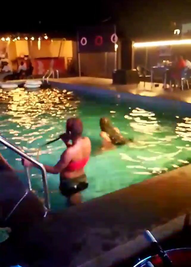 dimly lit, nighttime scene at an outdoor pool. A woman in a red bikini top is standing in the water, holding a microphone and appearing to sing. Another woman is swimming nearby. A man, wearing a dark-colored outfit, emerges from the pool, holding a yellow toy, and briefly dances near the pool's edge. The pool has lights in it, and behind it, there are tables and chairs. In the foreground, part of a red object and a blue plastic chair are visible.