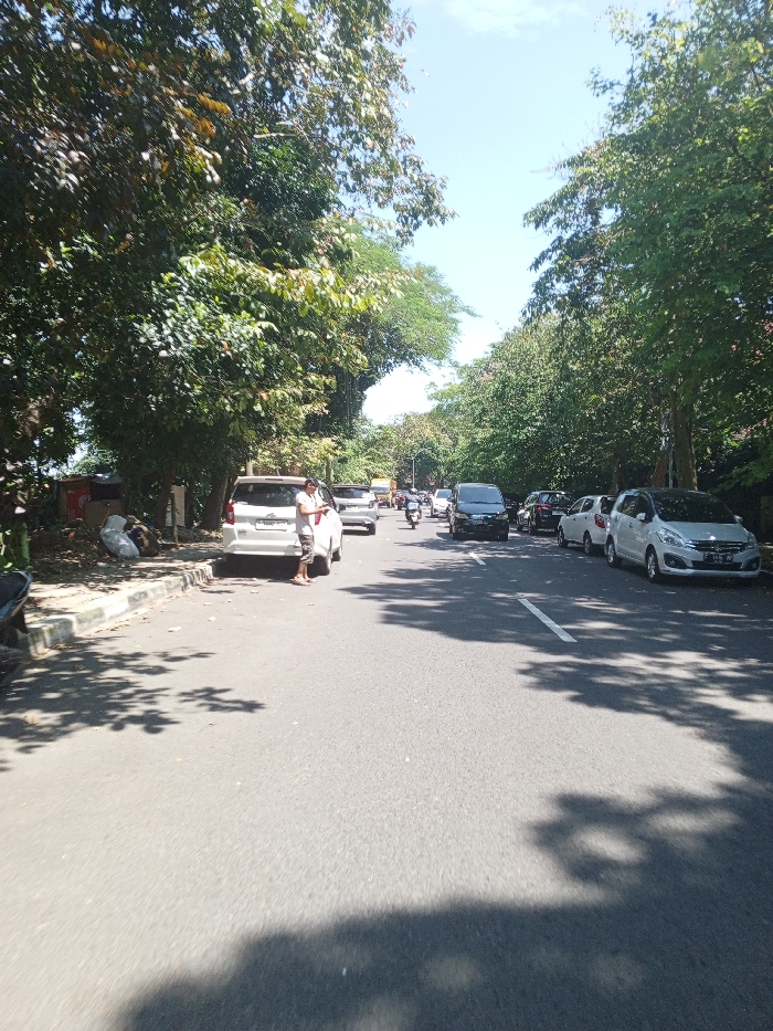 This image depicts an urban street scene in the city of Multhan, India, under clear, bright daylight. The street is asphalt, with a single white dashed line visible in the center. Dense green trees with full foliage line both sides of the road, casting prominent shadows onto the pavement. On the left side of the road, a raised concrete curb separates the roadway from an unpaved area with sparse vegetation and several white bags, likely containing refuse. A dark-colored scooter or motorcycle is partially visible parked on the far left. A white multi-purpose vehicle (MPV) is parked parallel to the curb, displaying license plate "B 2092 RPP". One individual, appearing adult, is standing on the street next to the driver's side of this white MPV, facing away from the camera. This person wears a light-colored t-shirt and shorts or bermudas. The main roadway shows vehicular traffic in both directions. Vehicles in the lane closest to the camera appear to be moving or stationary in a queue, including various cars (black, grey, silver) and at least two motorcycles, one with a visible rider. On the right side of the street, several vehicles are parked parallel to the curb beneath the treeline. These include a silver hatchback with a visible license plate starting "B 2588", a white hatchback, and a black van further down the street. The sky above is clear blue with minimal cloud cover.