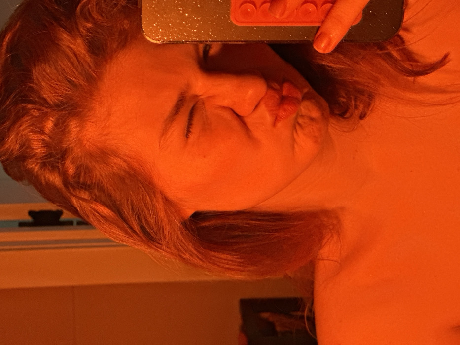 An individual is depicted in a close-up selfie taken indoors, under strong orange-red ambient lighting