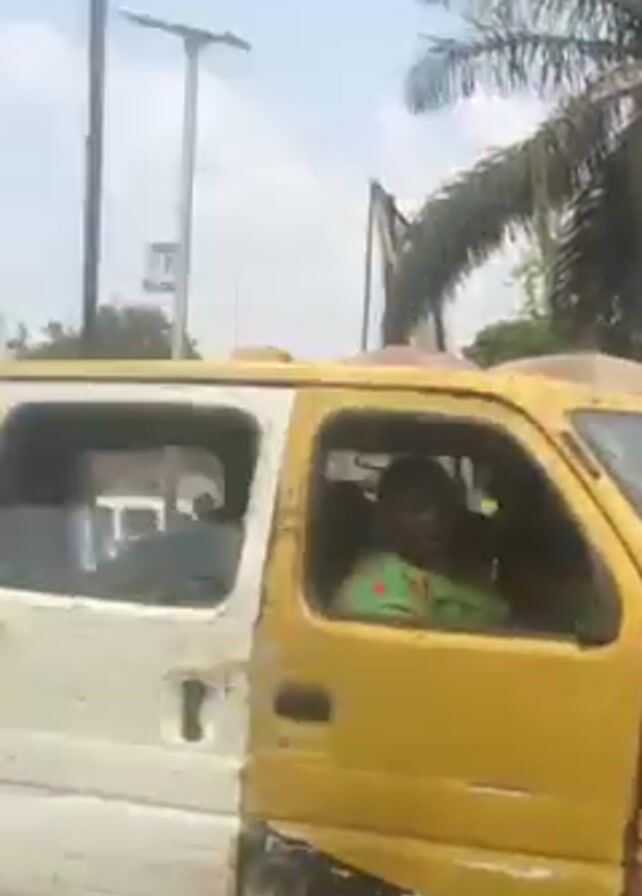 street scene with several commercial vehicles, including a yellow van and a three-wheeled auto-rickshaw. The foreground features the side view of the yellow van with its front heavily damaged. The vehicle is moving, passing by a busy roadside market area. Several market stalls are set up under umbrellas, with vendors and potential customers visible. One individual is sitting on the edge of a table within one of the stalls. A motorcycle is parked near the market. The backdrop includes a palm tree and a pole with a banner attached. The general setting appears to be a sunny day.