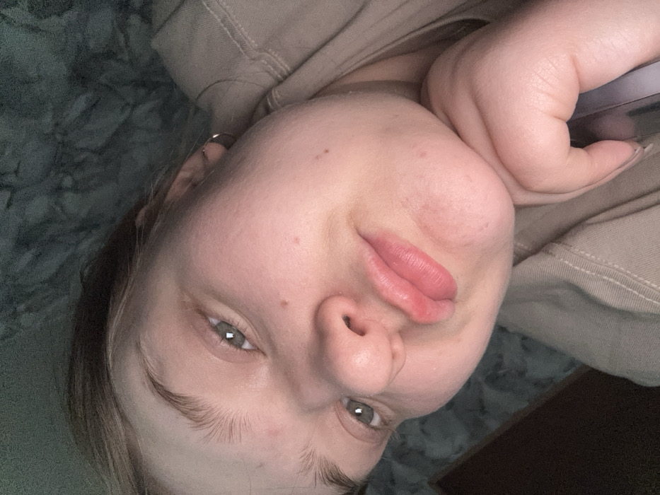 The image displays a close-up selfie of a young female individual situated in Ольховка, Russia