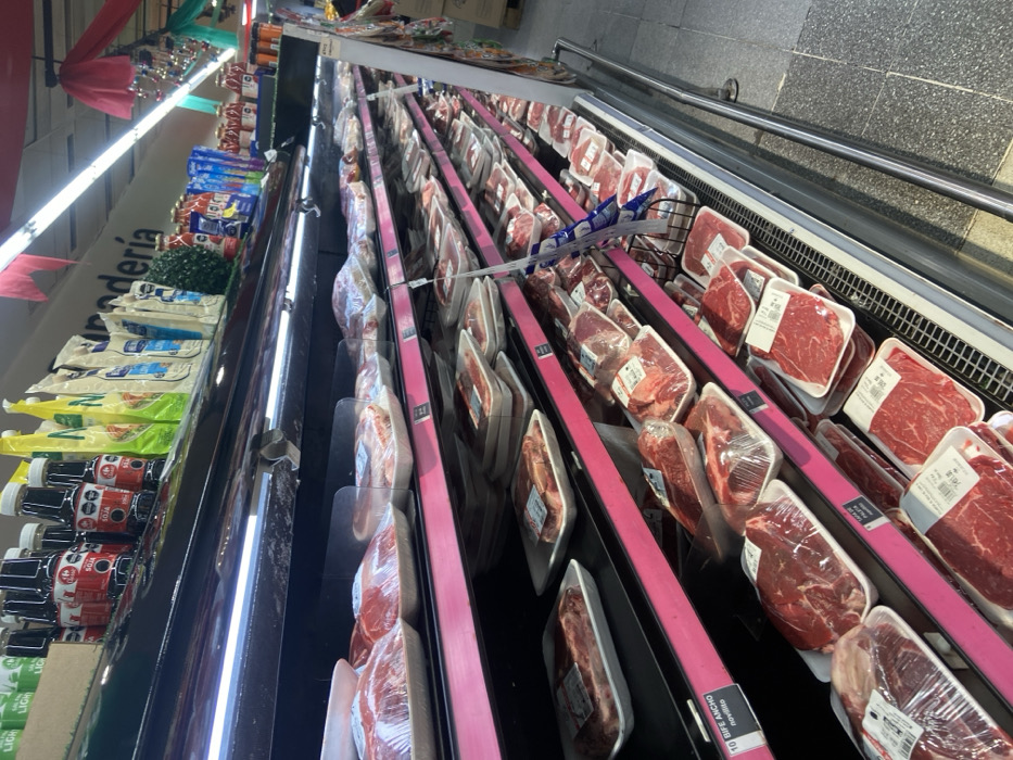 The image depicts a brightly lit refrigerated display case within a supermarket's meat section, confirmed to be located in Buenos Aires, Argentina