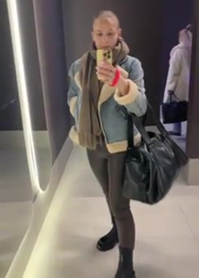 A woman is taking a selfie in a restroom or dressing room with mirrored walls. She is wearing a light blue denim jacket with off-white fur lining, a brown scarf wrapped around her neck, brown leggings, and black ankle boots with thick soles. She has a large black leather bag slung over her shoulder. She is holding a yellow smartphone with a triple-lens camera in her right hand and her head is shaved or very short. The room has gray walls and recessed lighting. A person carrying a black bag walks past in the background, partially obscured by the mirrored wall. The floors are light gray or white. The woman is centered in the frame and looking into the camera.