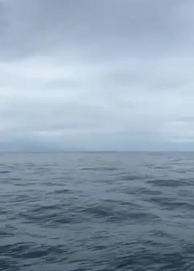 wide expanse of dark blue ocean under a gray, overcast sky. The camera appears to be on a moving boat, judging by the white water splashing in the lower part of the frame. The horizon line is visible in the distance, where the ocean meets the sky. There are no people or other objects visible in the video.