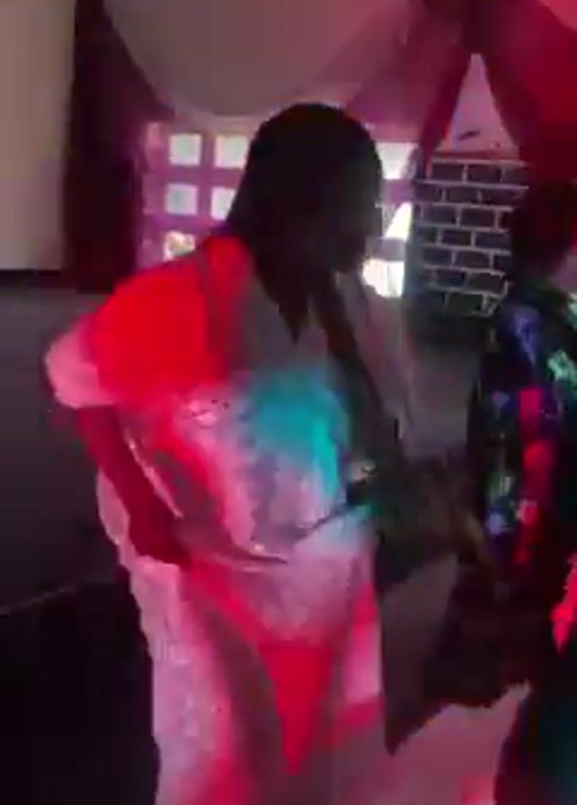 A person is dancing in a white lace outfit, with their hands on their hips. They have long, dark braids. The room has various colored lights shining on the dancer, and a decorative background. Other people are visible in the background, but they are out of focus. The video appears to be taken indoors, possibly at a party or celebration.