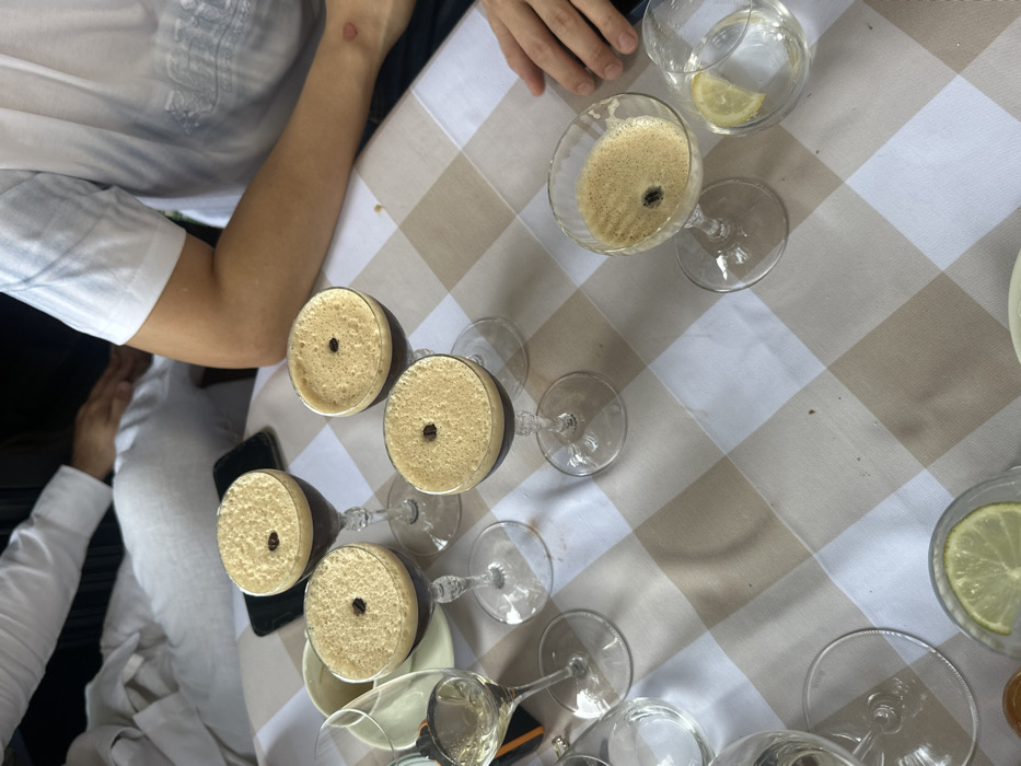 An overhead view captures a dining table set with a light brown and white checkered tablecloth in a venue located in Dubai, United Arab Emirates. Five espresso martini-style cocktails are present in stemmed glasses; four are nearly full with a dark liquid base, a thick layer of light brown foam, and a single coffee bean centrally placed on the foam. The fifth cocktail, positioned bottom right, is partially consumed with a lower foam level and a visible coffee bean. Two individuals are partially visible: one on the upper left, wearing a white long-sleeved garment and white trousers, with their hand resting on their lap; another on the right, wearing a white short-sleeved t-shirt, with their forearm and hand resting on the table, exhibiting a small red mark on the forearm. Additional items on the table include a partially visible black smartphone, a stemmed glass containing a clear liquid, a clear tumbler with a lemon slice and clear liquid, and a partially visible clear glass with a lime slice. Scattered small debris and stains are visible on the tablecloth.