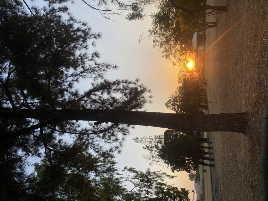 A landscape shot shows a sunset obscured by trees. The sun casts a bright orange glow near the center, filtering through distant branches. A prominent pine tree dominates the left, its dark silhouette contrasting with the brighter sky. To the right, a row of trees lines a grassy field. The horizon is partially visible, with what appears to be a building in the distance. The overall scene evokes a sense of tranquility.