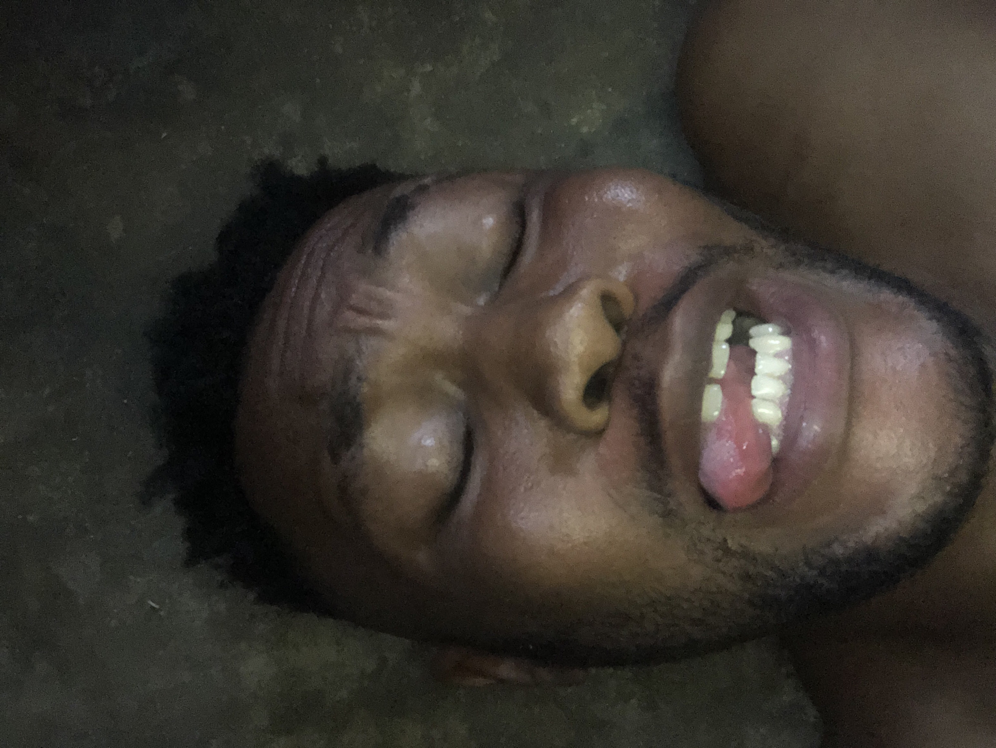 dark-skinned man lying on his back on a dark, possibly concrete, surface. His eyes are closed, and his mouth is open, revealing his tongue and upper teeth. The lighting is dim, casting shadows across his face. The setting appears to be in an indoor location. The exact location is Unknown, Unknown.