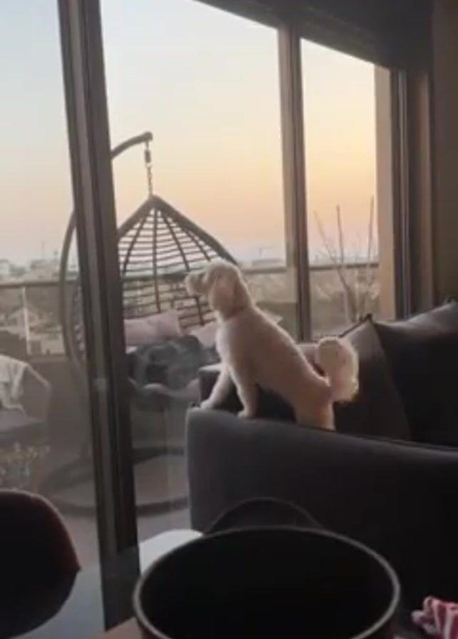A small, white dog is standing on the armrest of a gray sofa, looking out through a large glass window. Outside the window, there is a balcony with a hanging wicker chair and pillows. In the background, a sunset is visible, with the sky transitioning from blue to orange. Inside the room, in the foreground, there is a black bucket-like container and a dining table with a red and white patterned cloth. A hand comes into frame at the right side, briefly touching the container. The dog barks a couple of times.