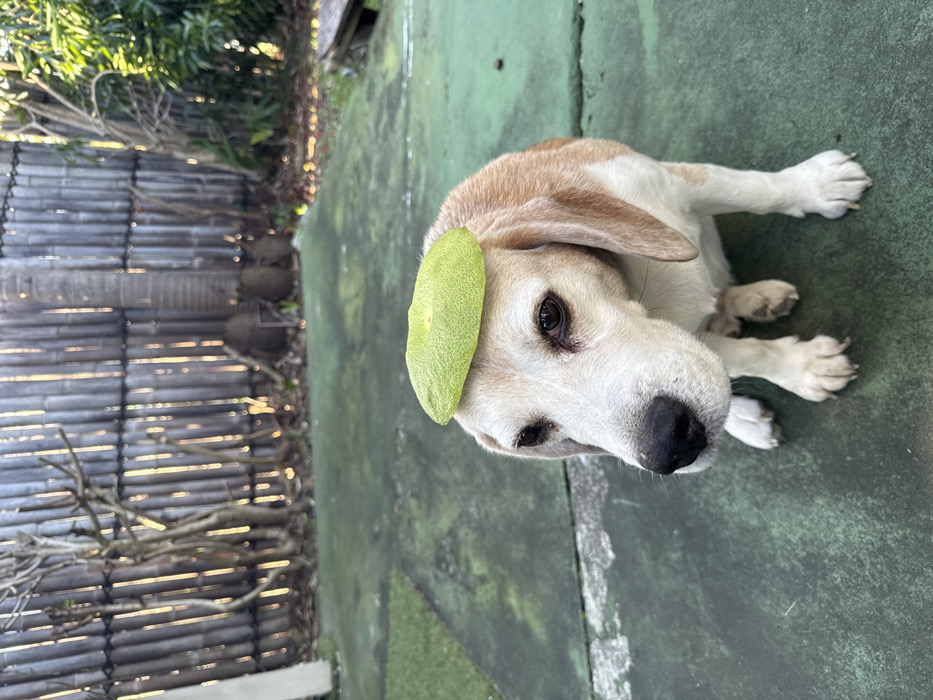 A tri-color Beagle dog is depicted seated on a weathered, green-tinted concrete surface in Dumbéa, France. A flat, circular, light green object, approximately 10-12 cm in diameter with a central indentation, rests on the dog's head. The dog's gaze is directed downwards and slightly towards the left of the frame. In the background, a tall bamboo fence runs horizontally, illuminated by natural sunlight filtering through its vertical segments, creating distinct patterns of light and shadow. Behind the fence, various trees and sparse vegetation are visible, including a prominent palm tree trunk. Patches of soil and ground cover are present at the base of the fence, and a small, weathered wooden structure is partially visible on the ground to the far right. The scene is under natural daylight conditions.
