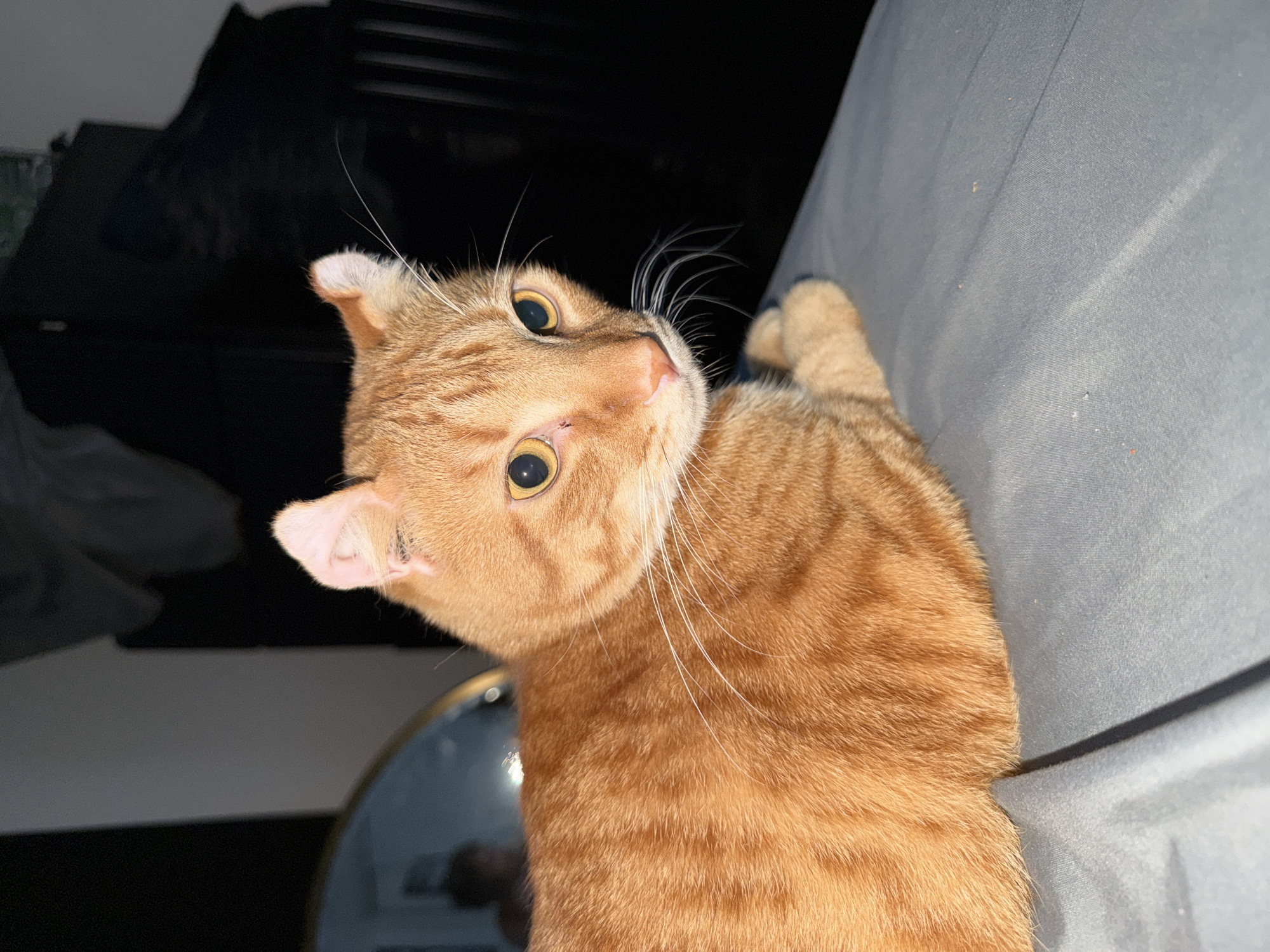 An orange tabby cat is observed resting on a light gray fabric surface, likely a bed, in an indoor setting. The cat's body is oriented to the left, while its head is turned slightly to the right, presenting a direct, forward gaze. Its fur exhibits distinct orange and brown tabby stripes, and its ears are slightly flattened. A small scab or mark is visible on the bridge of its nose, between its large, reflective golden-yellow eyes. Prominent white whiskers extend from its muzzle. Its front paws are tucked beneath its body. In the blurred background to the left, a partial reflection of a human figure, likely the photographer, is visible within an oval or round mirror. The remainder of the background is largely obscured by darkness, indicating low light conditions, and includes indistinct shadowy forms of furniture or objects. The environment is consistent with a residential interior, such as a bedroom or living room. The exact location within the city of Los Angeles, United States of America, cannot be determined from the visual information provided.
