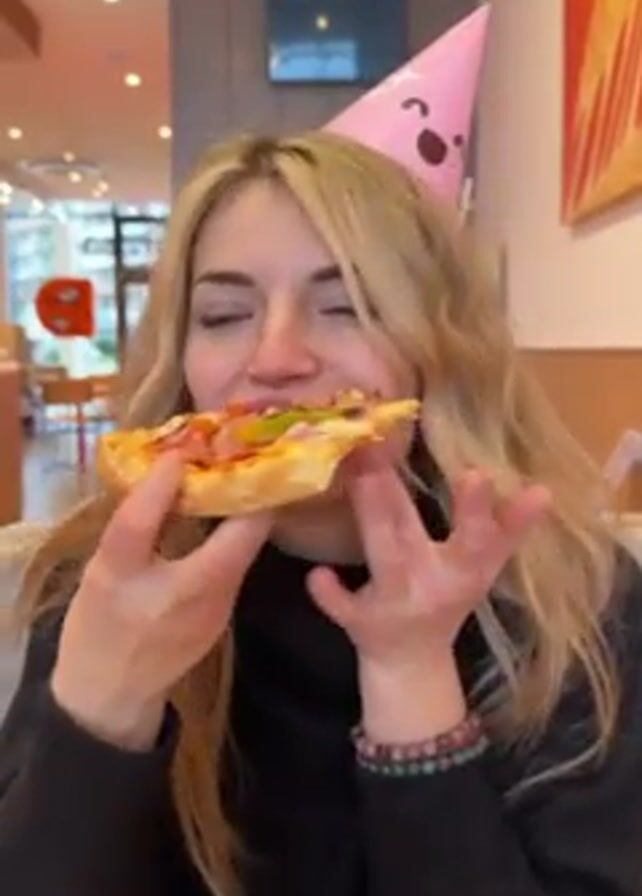 A blonde-haired woman wearing a black turtleneck and a pink party hat is sitting at a table in what appears to be a restaurant or cafe. She is holding a slice of pizza with multiple toppings and takes a bite. She chews, looks at the camera, and seems to be enjoying the pizza. The background of the shot includes other tables and chairs, lighting fixtures, a sign on a pillar, and a piece of art on the wall. The overall scene seems to be a casual and perhaps celebratory setting.