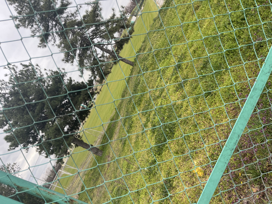 A forensic description of an outdoor sports field in Stara Zagora, Bulgaria, is provided. The scene is viewed through a green chain-link fence that dominates the immediate foreground. The fence exhibits a square mesh pattern, approximately 5-7 cm per side, and includes a horizontal green metal support bar in its lower portion, angled distinctly upwards from the lower left to the upper right. Behind the fence, a natural grassy slope descends, covered with mixed green vegetation and scattered small purple flowers. A single, distinct yellow object, possibly plastic, is visible resting on this slope near the bottom left corner, adjacent to the horizontal fence bar. Beyond the incline, a well-maintained, bright green turf sports field, consistent with a football pitch, occupies the mid-ground. White goalposts are clearly discernible on the left side of the field, marking a designated playing area. Several mature pine trees with dark green needle foliage and brown trunks are present within the scene: one is situated on the grassy slope to the left, partially obscured by the fence, while two others stand further into the mid-ground and background along the field's periphery. The sky overhead is uniformly overcast and light grey, indicating diffused natural light conditions. No individuals are present, and no activities or interactions are depicted within the frame.