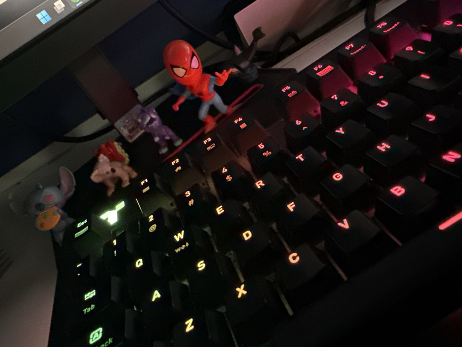 The image displays an indoor, low-light environment focused on a black mechanical keyboard featuring customizable RGB backlighting. The left side of the keyboard exhibits green illumination, transitioning to yellow and orange in the center, and red or pink illumination towards the right side and function keys (F5, F6, F7, F8). Several small, static figurines are positioned on the keyboard's top edge. From left to right, these include a gray, rabbit-like figure holding an orange object; a light brown, possibly plush-textured figure with a red element on its back; a purple humanoid figure; a cartoonish Spiderman figurine in red and blue, standing upright; and a dark, indistinct figure (possibly Batman) lying near the right edge of the keyboard. In the upper right background, a portion of a computer monitor screen is visible, displaying light blue and white interface elements from a Windows operating system, including taskbar icons. The immediate environment suggests a desk or workstation setup, with cables partially visible behind the figurines. The specific location within the city of Sofia, Bulgaria, cannot be determined from the visual information provided in this image.
