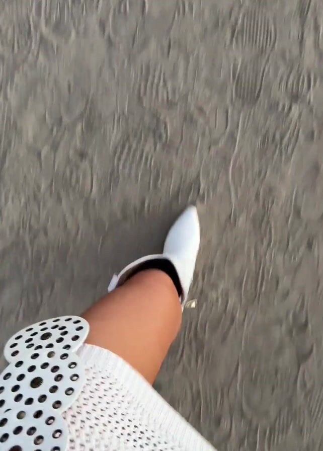 A person wearing white boots and a white skirt is walking on a textured gray surface. The camera is positioned at a high angle, focusing on the person's legs and feet as they move forward. The surface appears to be concrete or pavement with irregular patterns or textures.