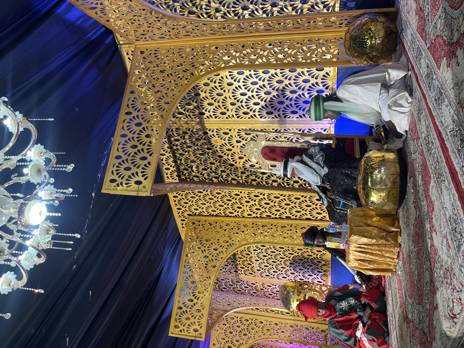 A lavishly decorated space features ornate gold lattice structures forming archways and walls. Two figures in traditional attire are visible: one in white and green, kneeling, and another in black and white seated in a throne-like chair. Golden cushions and drums add to the opulence. A grand chandelier hangs against a backdrop of dark blue fabric, while an intricately patterned carpet covers the floor, creating a royal or ceremonial atmosphere.