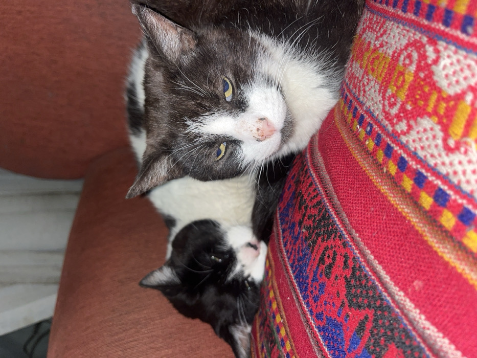 - "Two tuxedo cats are curled up together on a red cushion" by FM-ZkP5p1, licensed under CC BY 4.0