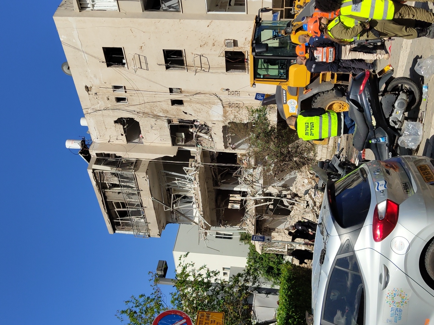An urban scene in Tel-Aviv, Israel, depicts a multi-story residential building with severe structural damage, indicative of a collapse or explosion. The building's lower and middle floors are extensively compromised, with large sections of external walls, balconies, and internal structures missing or collapsed into a pile of debris at the base. Shattered glass, exposed rebar, and twisted building materials are visible throughout the damaged section. In the foreground, a silver hatchback car (Hyundai i10 model) with an Israeli license plate and "TEL AVIV YAFO" municipal sticker is parked, facing away from the viewer. Behind it, a black scooter is parked on the street, near scattered clear plastic bags and a water bottle. To the right of the vehicles, several individuals, likely emergency responders, are present. A man wearing a neon yellow vest with Hebrew text "בשורות העירייה" (Municipality Operations) stands facing a yellow Volvo front-end loader, which is positioned close to the damaged building. Adjacent to the loader, a group of personnel includes individuals in dark uniforms with reflective stripes, some wearing orange helmets. One person's vest clearly displays "פיקוד העורף" (Home Front Command), and another appears to be uniformed police ("משטרה" in Hebrew). An individual in an olive green military-style uniform also wears a reflective yellow vest and an orange helmet. Further into the scene, closer to the building's base, additional figures in dark attire are discernible amidst the rubble. A "no entry" sign and a yellow Hebrew sign are partially visible on the far left. The sky above is clear and blue.