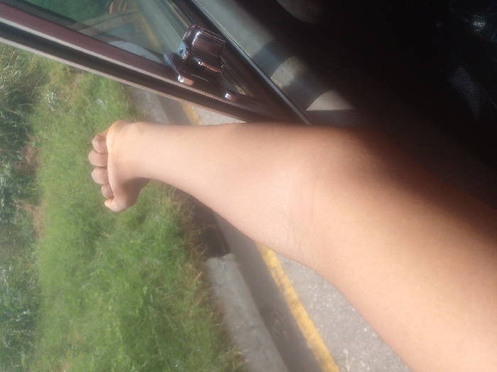A human forearm, exhibiting a medium-to-dark skin tone, is extended with a clenched fist from the interior of a vehicle, projecting outward through an open window