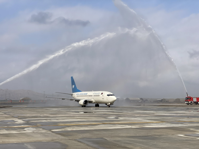 - "A white passenger jet aircraft, identified as an Ariana Afghan Airlines plane by its livery and a light blue tail fin with a white emblem, is positioned on a wet airport tarmac" by FM-B5wmg2, licensed under CC BY 4.0