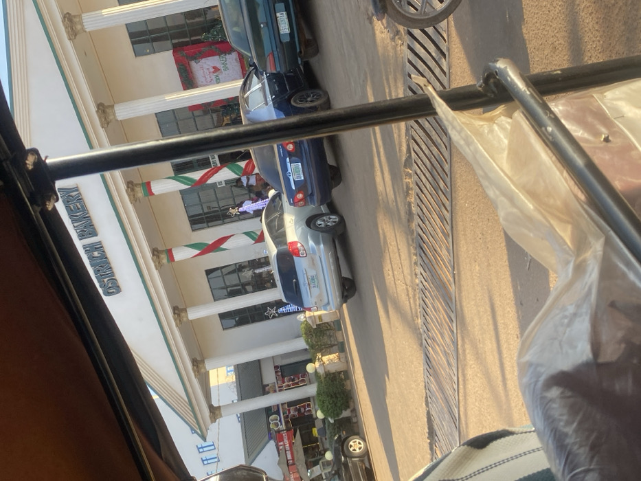 The image depicts the exterior of the Ostrich Bakery, located in Sabon Tasha, Nigeria, captured from the interior of a vehicle. The bakery is a white, two-story structure exhibiting a classical architectural style with a green-edged roofline and multiple white columns featuring gold-colored capitols. These columns are adorned with red and green striped fabric and white illuminated star ornaments. Additional festive decorations include white illuminated figures near the entrance and a prominent red banner with white text, partially legible as "Ostrich Bakery," affixed to the facade on the right side of the main entry. A paved parking area in front of the bakery holds multiple vehicles: a silver Toyota SUV with license plate T14-08BG, a dark blue Toyota Corolla sedan with license plate DKA-830KS, and a dark green sedan with license plate FST-197XA. A dark-colored vehicle is partially visible on the far left, and the wheel of a motorcycle appears on the far right. Indistinct human figures are present near the bakery's glass entrance. The ground surface is a mix of paved and light brown unpaved areas, with elongated shadows cast across it, indicating either morning or late afternoon lighting. A metal drainage grate diagonally traverses the mid-ground. The immediate foreground reveals elements of the viewing vehicle, including a dark metal frame, a translucent plastic sheet, and a section of a striped fabric seat.