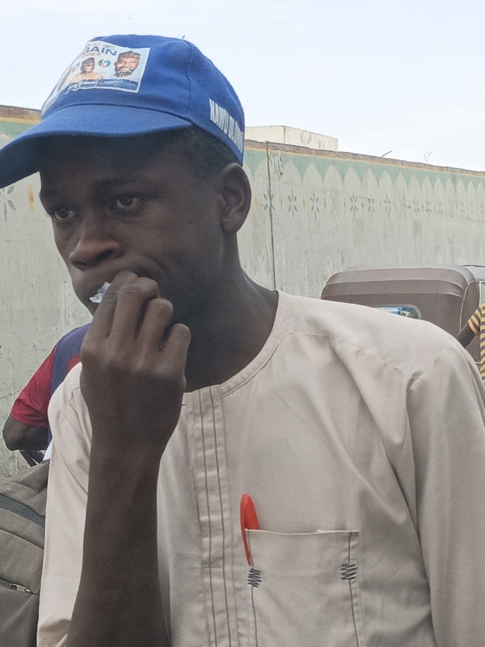 The image displays a young adult male, of dark complexion, in an outdoor urban setting in Fagge C, Nigeria