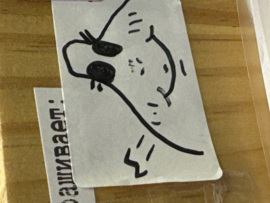 The image presents a close-up view of two white paper labels affixed to a light brown wooden surface. The dominant lower label, rectangular with rounded corners, features a hand-drawn cartoon figure in black marker. This figure depicts a smiling, amorphous creature with two large, dark circular eyes and a pair of headphones over its head. Several small dash-like marks are present on its face, and a wavy line with two short dashes extends from its left side. Above this, a partially visible strip of white paper displays printed Cyrillic text: "рашивает:", which translates to "asks:". The wooden background exhibits vertical graining. A thin, transparent, horizontal strip, likely plastic or glass, runs across the bottom portion of the image, obscuring the wood beneath the main label. No individuals, specific actions, or interactions are discernible. The precise location within the city of Saint Petersburg, Russia, cannot be determined from the visual evidence provided.