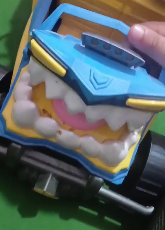 person’s hand opening and closing the top of a toy car. The toy car is yellow and blue and has a mouth on the front with a pink tongue and white teeth. The background is a green surface. Another toy is visible in the background.