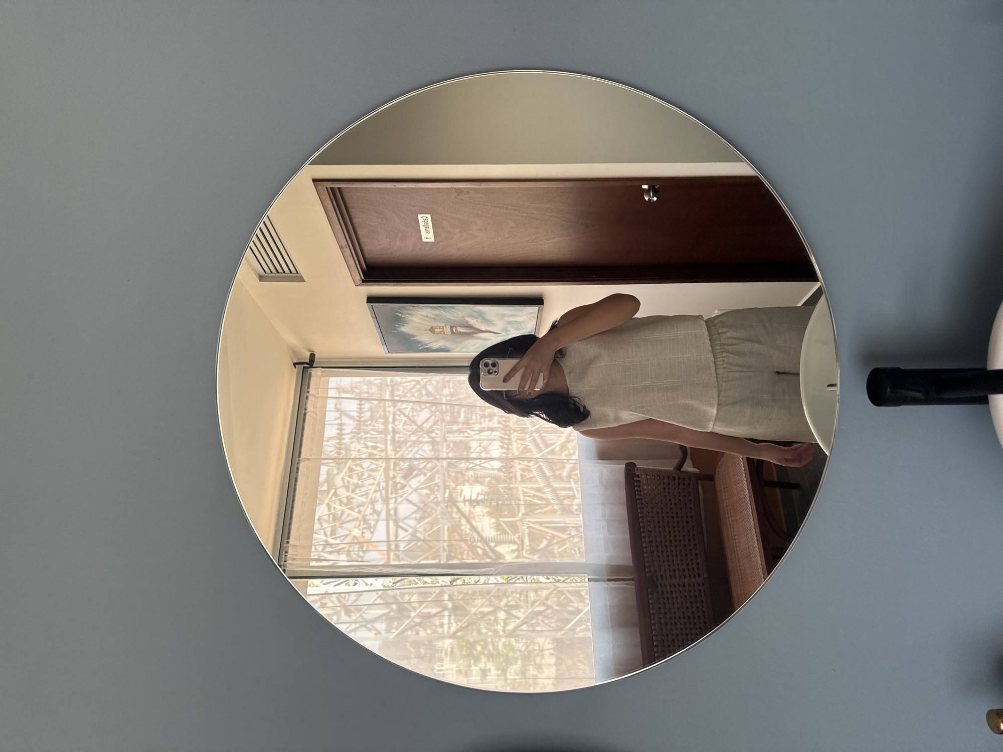 A circular mirror reflects a woman taking a picture of herself with a cell phone, likely in a hotel room in Acapulco, Mexico, with a partial view of a window. The room has a brown door above a framed picture and a window overlooking a metal infrastructure and trees. The mirror is mounted on a blue wall.
