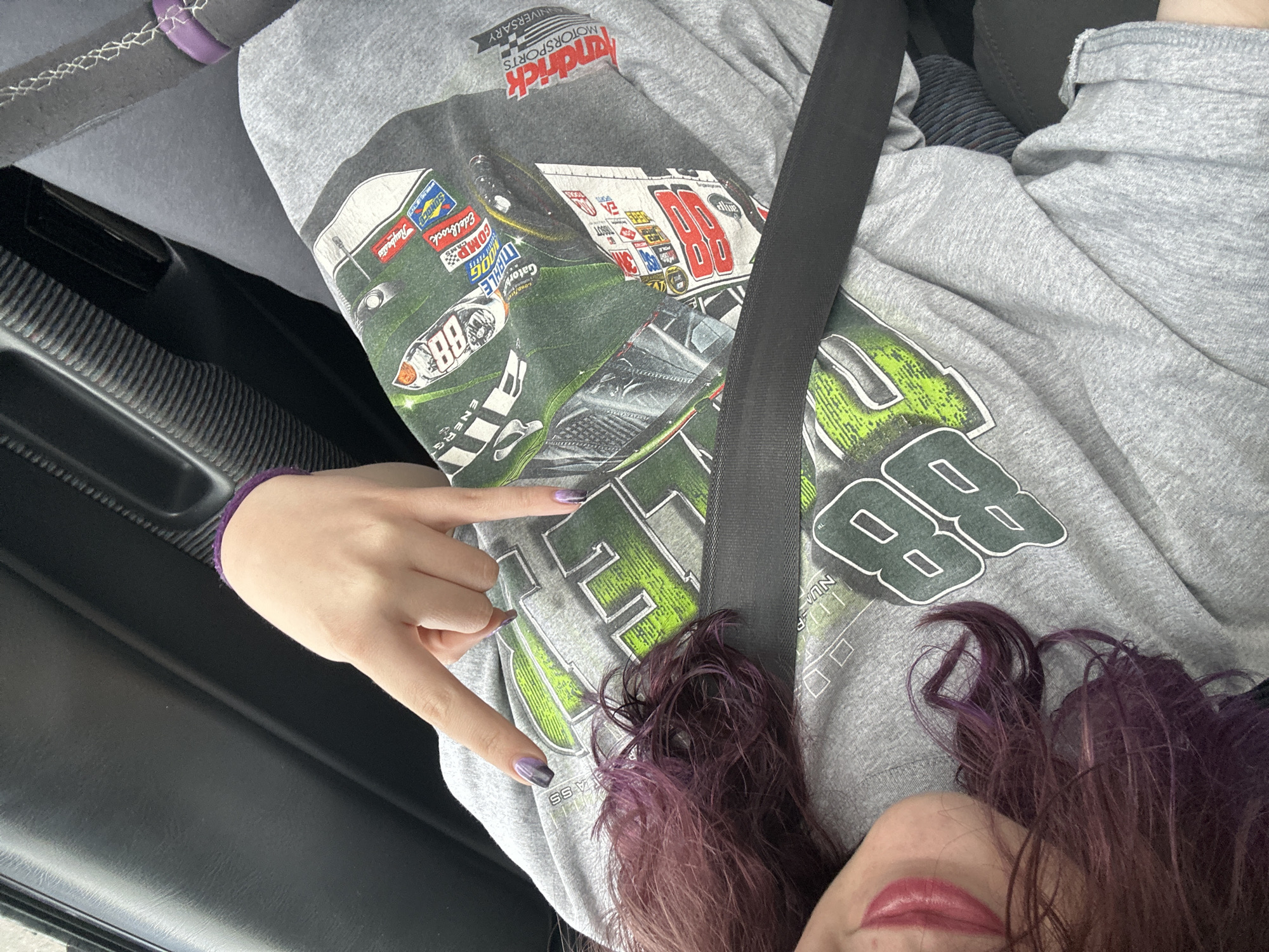 person wearing a gray sweatshirt with a race car graphic, buckled into a car. The graphic features the number "88" and various sponsor logos including "Hendrick Motorsports," "Sunoco," and "Edelbrock." The person has purple hair and purple lipstick and is making a "rock on" hand gesture. The interior of the car is visible, including the seat, door panel, and seatbelt. The image does not contain information that allows for identification of the city.