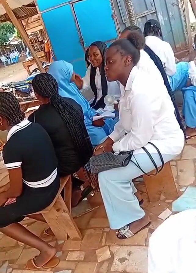 A group of young women sit on wooden benches under a makeshift shelter. They are wearing a variety of clothing, including school uniforms and casual outfits. One woman wears a blue headscarf. Some of the women are interacting with each other, while others are looking straight ahead. A small white handheld fan is visible. A building made of metal panels is in the background.