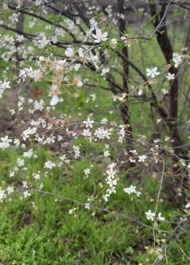 The camera pans from a blooming tree with white flowers to a medium-sized brown dog on a leash