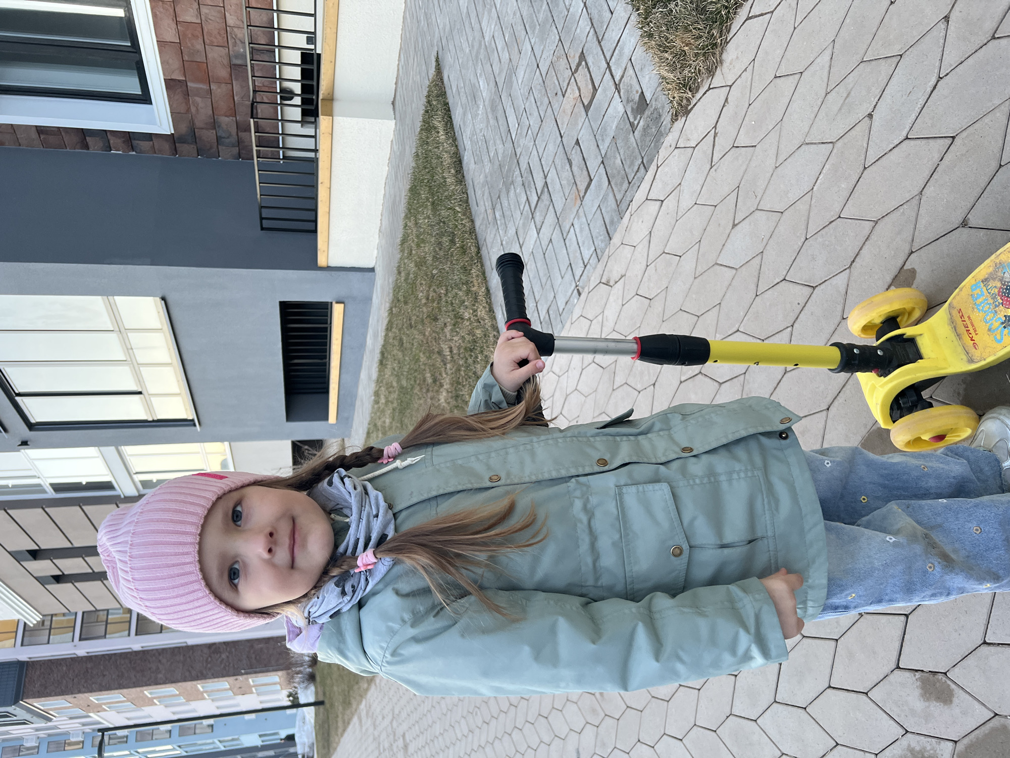 A young girl stands on a patterned concrete walkway in Chemoshur, Russia. She is wearing a pink knit hat, a light green jacket, a grey scarf, and light blue jeans with small floral patterns. Her hair is styled in braids tied with pink hair ties. She holds a yellow and silver scooter. The background includes a modern building with a mix of brick, grey, and white exterior, and patches of grass.