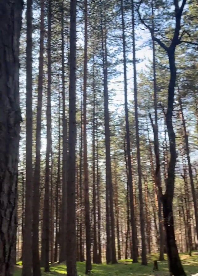 sunny, coniferous forest. The sun shines through the tall, thin tree trunks, casting long shadows on the ground. A man with a backpack walks through the forest. The forest floor is covered in pine needles and moss. The sky is blue and clear.
