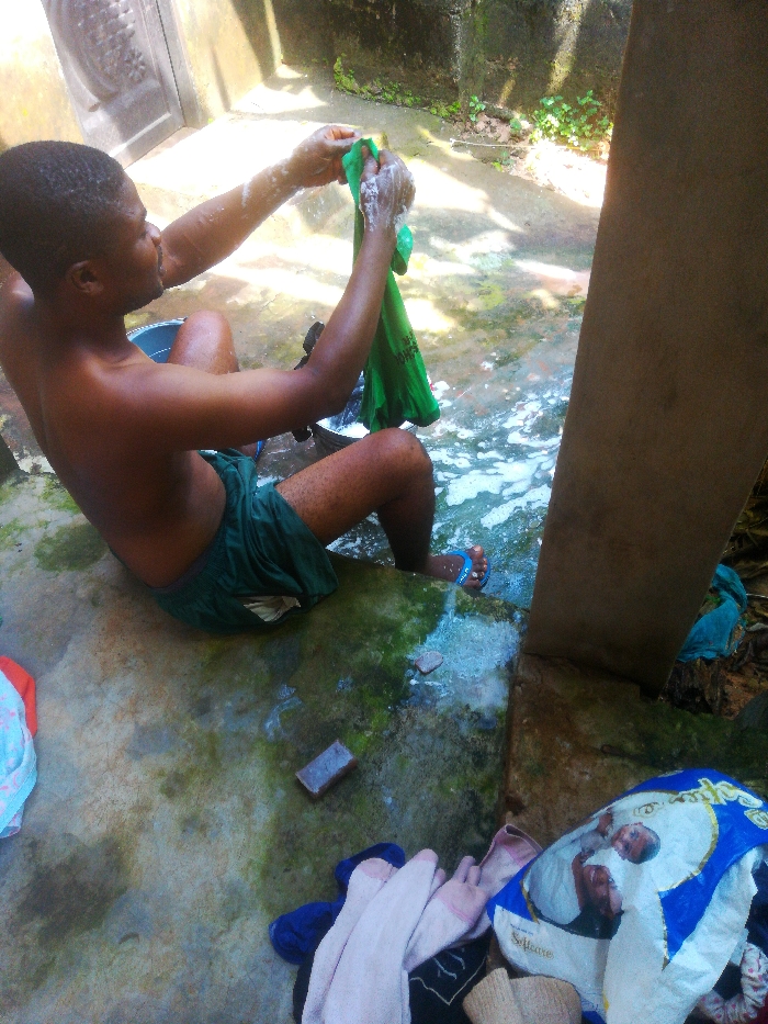 A dark-skinned male, shirtless, wearing dark green shorts and blue flip-flops, sits on a wet concrete surface, actively hand-washing a bright green garment